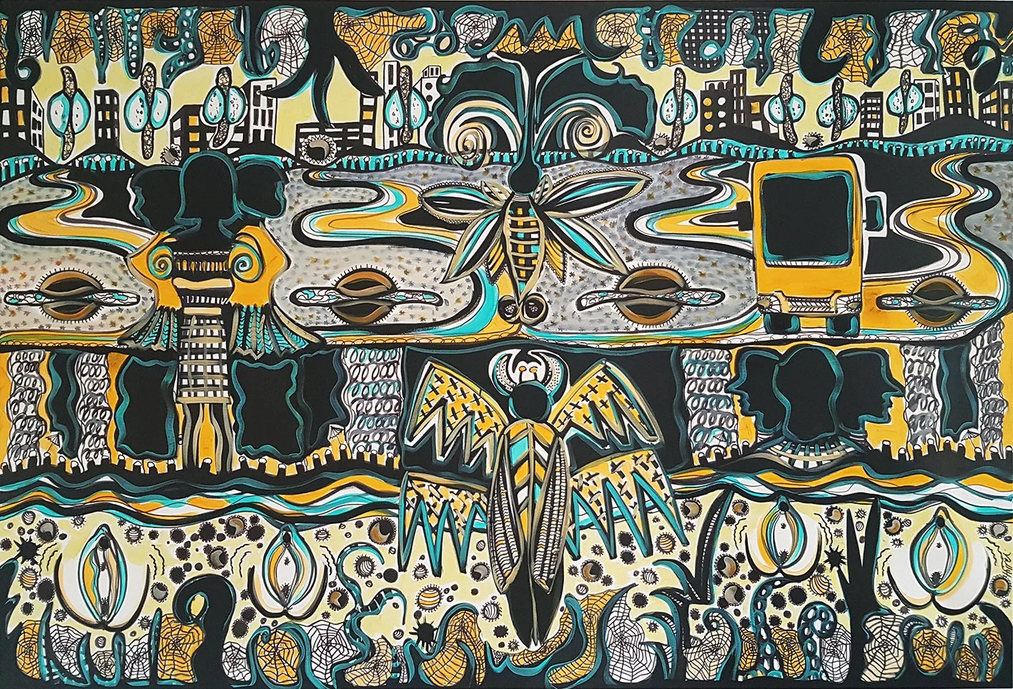 In meinen Edding-Bildern wurde ich inspiriert von typischen Skizzen/Krakeleien, die ich ganz nebenbei während des Telefonierens zu Papier brachte. Auf der Leinwand benutzte ich dann den klassischen Edding-Marker in verschiedenen Stärken, kombiniert mit Acrylfarbe. Es entstand eine bizarre Welt in Form eines Wandteppichs mit tätowierten Bratwürsten, Tiefsee-Vaginas, insektenähnlichen Flugobjekten oder in Form eines großen Porträts, welches an die Gesichtsbemalungen der Maoris erinnert.