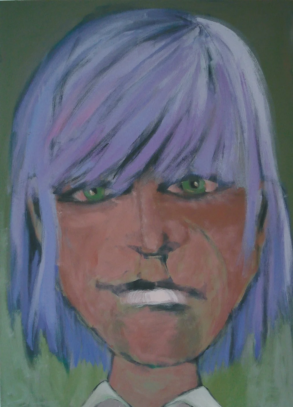 Wir begegnen einer jungen Frau mit lilafarbenen Haaren. Sie dreht uns den Rücken zu, steht seitlich zu uns oder schaut uns gerade ins Gesicht.