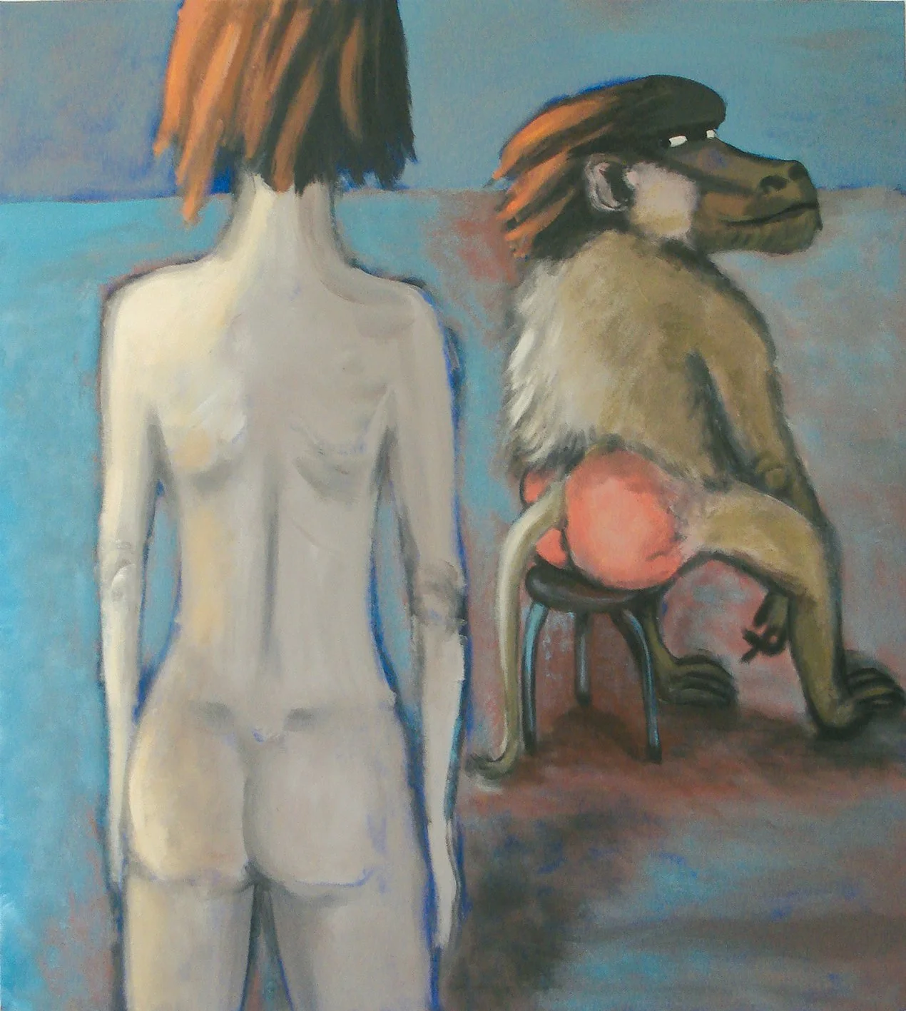 Gisela ist aber auch zerbrechlich. Nackt und schutz-los steht sie mit dem Rücken zu uns. Ihr Gesichts-ausdruck bleibt uns verborgen. Was mag sie denken? Hat sie die Augen geschlossen? Vor ihr sitzt ein Pavian. Er dreht sich von ihr weg und schaut zurück. Ob die beiden zueinander finden werden, sagt uns das Bild nicht. Wir erkennen auch nicht, welche Beziehung die beiden zueinander haben, ob sie sich finden wollen oder einander nur ewig ansehen werden.